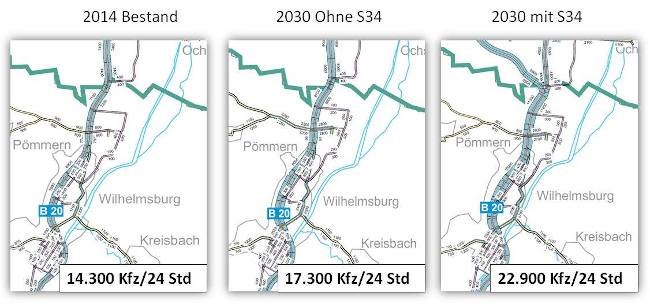 In der UVP zur S34 aus 2017 hat man an der nördlichen Stadteinfahrt von Wilhelmsburg in 2014 pro Tag 14.300 Autos gezählt. Die Prognose sieht für 2030 ohne weitere Ausbaumaßnahmen 17.300 Autos pro Tag rollen. Wenn die S34 gebaut werden sollte, prophezeit man allerdings 22.900 KFZ pro Tag.